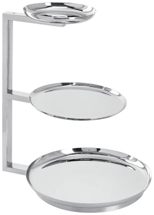Displej sa tri ploče Ø 16 cm, 21 cm i 27 cm od nerđajućeg čelika 18/10 hrom-nikl. Sa neklizajućim gumenim nogama za sigurno postolje. Visokokvalitetna završna obrada. Može se prati u mašini za pranje sudova.