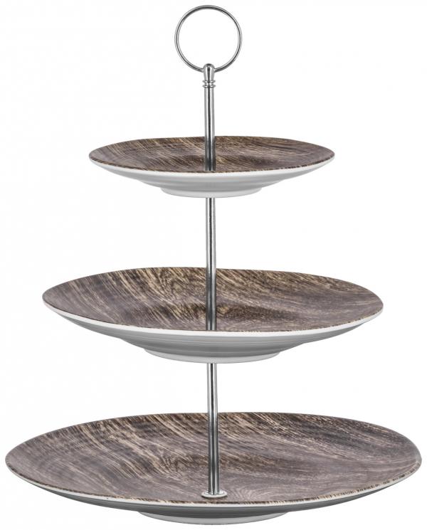 Troslojni stalak napravljen od melamina u drvenom izgledu i stubovima od hromiranog čelika. Pojedinačne melaminske ploče za pranje posuđa su sigurne, stubovi nisu pogodni za mašine za pranje sudova.