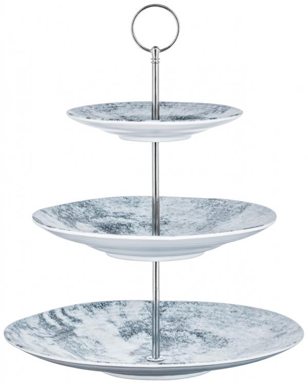 Troslojni melaminski stalak u lažnom mermeru sa hromiranim čeličnim stubovima. Tri ploče dimenzija 27,5 cm, 22,5 cm i 16 cm.Pojedinačne melaminske ploče, mašina za pranje posuđa, stubovi nisu sigurni za mašinu za pranje posuđa.