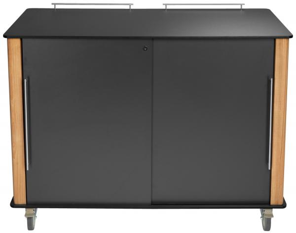 **Outdoor service station Barugo** Outdoor service station for the catering trade - robust, weatherproof and perfect for professional use. This high-quality service station for outdoor catering, hotels, terraces and event areas combines durable materials, sophisticated functionality and modern design. Developed for daily outdoor use, it offers maximum stability, flexibility and comfort for your service staff. Barugo at a glance: * weatherproof & UV-resistant thanks to teak & HPL * resistant to cigarette burns * Impact and scratch-resistant in accordance with DIN EN 438 * abrasion-resistant surface for a long service life * mobile, safe & efficient - perfect for any service set-up Barugo is made of HPL compact panels and teak, making it extremely robust and ideal for continuous outdoor use. The combination of HPL and FSC®-certified teak creates a warm and natural look. If the teak is left untreated, it develops an elegant silver-grey patina over time - a natural discolouration that does not affect stability or durability. Thanks to the natural oils contained in the wood, teak has been considered one of the most reliable materials for outdoor furniture for decades. If you want to retain the original, warm wood colour, treat the slats with special teak oil once or twice a year. Please clean thoroughly beforehand. The service station impresses with details that make all the difference: * Body not 100% waterproof - prevents mould growth as air can circulate * Water drainage system in the base - ideal for outdoor use * Rounded corners for a modern look * Flexible shelves - 2 shelves included, additional shelves available in a double pack * Perfectly matched volume for standard catering stacking containers measuring 60x40 cm * specially rounded doors for quiet, smooth gliding * Convenient, large door handles for quick opening & closing * incl. 2 keys: locks can be replaced if necessary * rust-free, robust and absolutely suitable for outdoor use - all fittings and screws are made of 18/10 stainless steel * All four castors are lockable * Lockable sliding doors, incl. 2 keys * Replaceable locks The service station is supplied disassembled and is easy to assemble. The scope of delivery includes * 5x teak slats * HPL panels for the body * Castor set consisting of 4x rubber castors * 4x 18/10 stainless steel handles (2x for the sliding doors and 2x as fall protection) * 2x shelves incl. shelf supports - additional shelves can be purchased if required * Lock for locking incl. 2 keys * Grey protective cover made of 100% polyester (washable at 30 °C), with specially coated and water-repellent inside