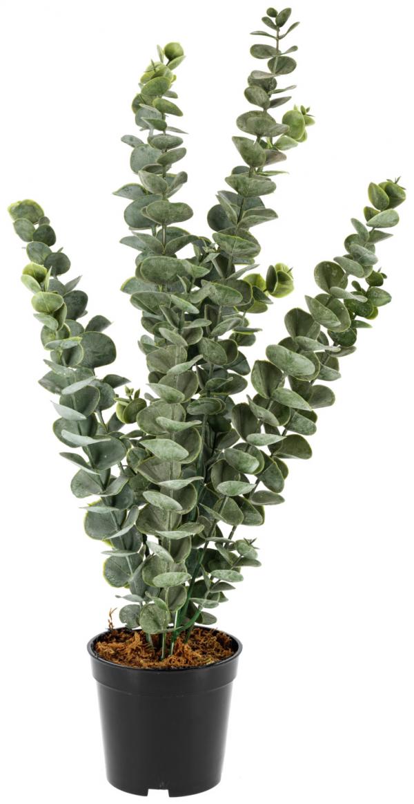 Obmanjujuće prava biljka eukaliptusa u crnoj plastičnoj posudi. Visina 51 cm.