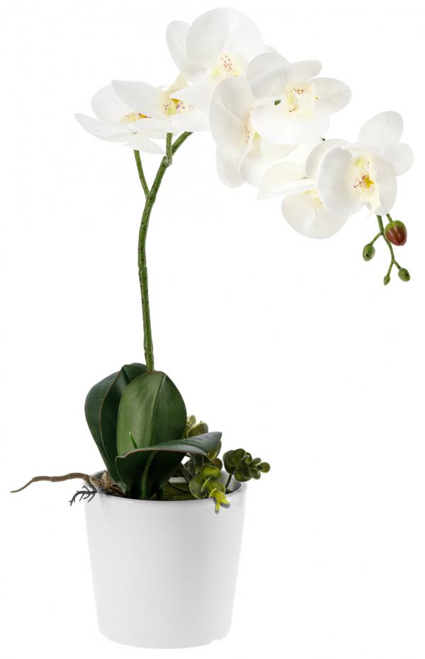 Vještačka biljka koja se teško razlikuje od prirodnih. Jednostavna za njegu i idealna za ugostiteljstvo: Orhideja ne zahtijeva zalivanje i može stajati i na tamnim mjestima. Ã ̃xH pot: 12x13 cm. Materijal: tekstil/plastika. Održavanje: Vlažnom krpom. Za unutrašnju i spoljašnju upotrebu.