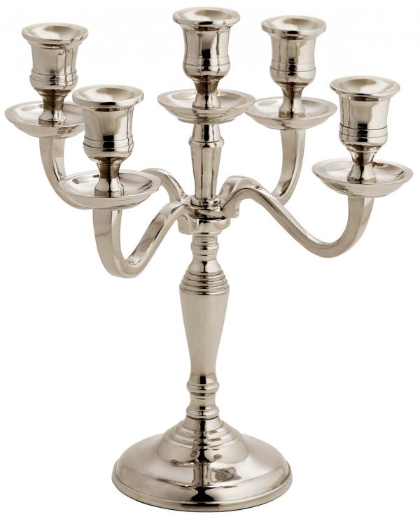 Petoruki svijećnjak u vanvremenskom dizajnu. Sa širokom bazom za stabilnost i zaštitu od kapanja - da bi stolovi bili čisti! Sa neklizajućom gumom na dnu. Materijal: aluminijum.