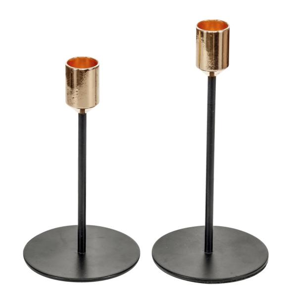 Elegantni svijećnjaci napravljeni od crnog obloženog metala sa zlatnim držačem za svijeće u kompletu od 2. à ̃xH mali: 8x14.5 cm i à ̃xH velika: 8x18 cm