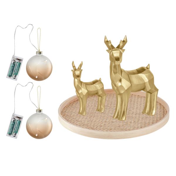 Set sadrži zlatnog jelena Augustina u dimenzijama 18k9k23 cm i 11,5k5k15,5 cm, dve LED kuglice Hina Ø8 cm i odgovarajuću ukrasnu tacnu Alara Ø37,5 cm. Baterije nisu uključene.