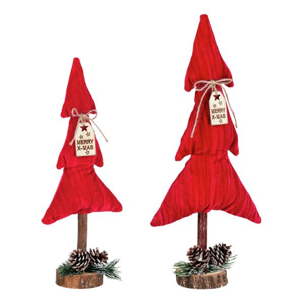 Komplet od dva ukrasna minijaturna drvca visine 35 cm i 42 cm od crvenog materijala i prirodnog ukrasa.