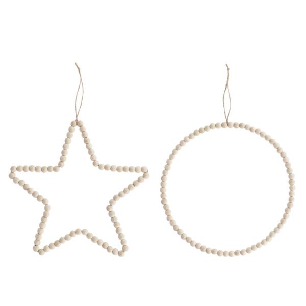 Moderna viseća dekoracija od drvenih kuglica na žičanom okviru u obliku kugle Ø30 cm i zvezde 30k28 cm.