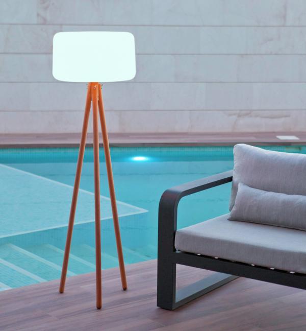 LED tronožna podna lampa za unutrašnju i vanjsku upotrebu sa solarnim napajanjem i baterijom. IP65 zaštita, sa daljinskim upravljačem za podešavanje boje svjetla između 6500 K i 2700 K. Temperatura okoline -20°C do 45°C. Trajanje osvetljenja 8-12 sati po punjenju baterije.