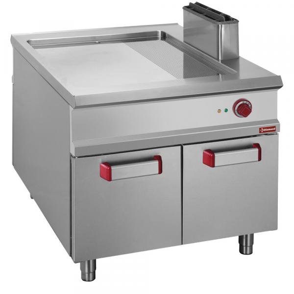 Ploča za kuvanje od livenog gvožđa (15 mm) visoke toplotne provodljivosti, nagnuta napred i opremljena ivicom protiv prskanja na 3 zavarene strane (3 mm) od nerđajućeg čelika, vodootporna. Posuda za rekuperaciju tečnosti za pečenje.