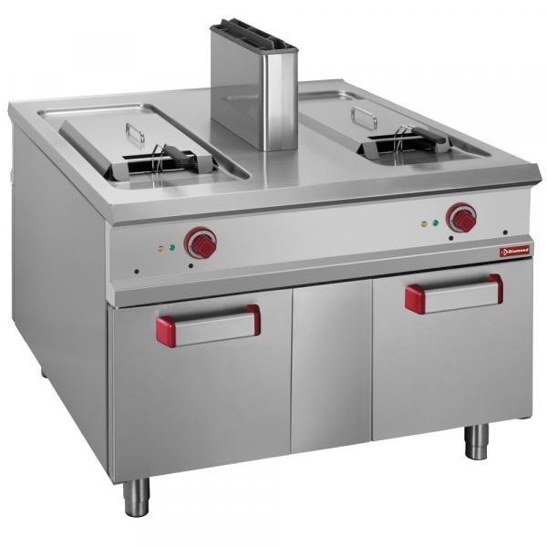Duboko vučeni rezervoar od nerđajućeg čelika AISI 304, sa zaobljenim uglovima i unutrašnjim uglovima, opremljen hladnom zonom, kugličnim ventilom za odvod vode postavljenim u ormanu. Poklopac od nerđajućeg čelika. Rezervoar za prelivanje ulja, smešten u donjem ormariću.