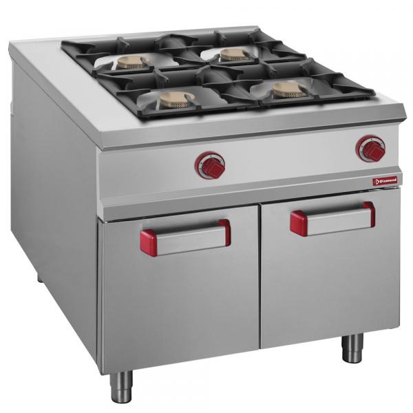 Gorionici od livenog gvožđa tretirani vodootporni, mesingane krune (sa veoma visokom efikasnošću). Regulacija gorionika od 2 do 9kW pomoću gasnog ventila, pilot paljenja i sigurnosti termoelementa, frontalni pristup omogućava veoma lako održavanje. Emajlirane rešetke od livenog gvožđa: 416x367 mm (može se prati u mašini za sudove).