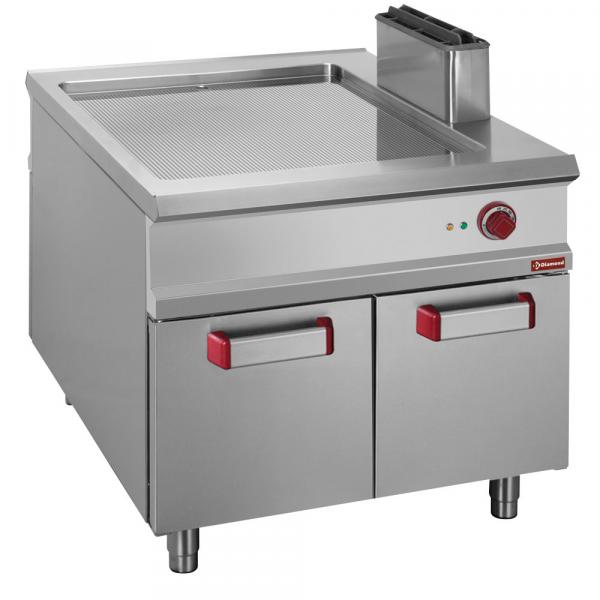 Ploča za kuvanje od livenog gvožđa (15 mm) visoke toplotne provodljivosti, nagnuta napred i opremljena ivicom protiv prskanja na 3 zavarene strane (3 mm) od nerđajućeg čelika, vodootporna. Posuda za rekuperaciju tečnosti za pečenje.