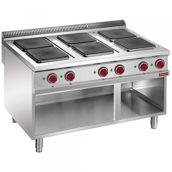 Kvadratne ploče od livenog gvožđa, 300x300 mm, sa vodootpornom ivicom od nerđajućeg čelika, sigurnosni uređaj u slučaju pregrevanja. Regulacija snage grejanja pomoću prekidača sa 7 položaja, pristupačnost sa prednje strane omogućava veoma lako održavanje.