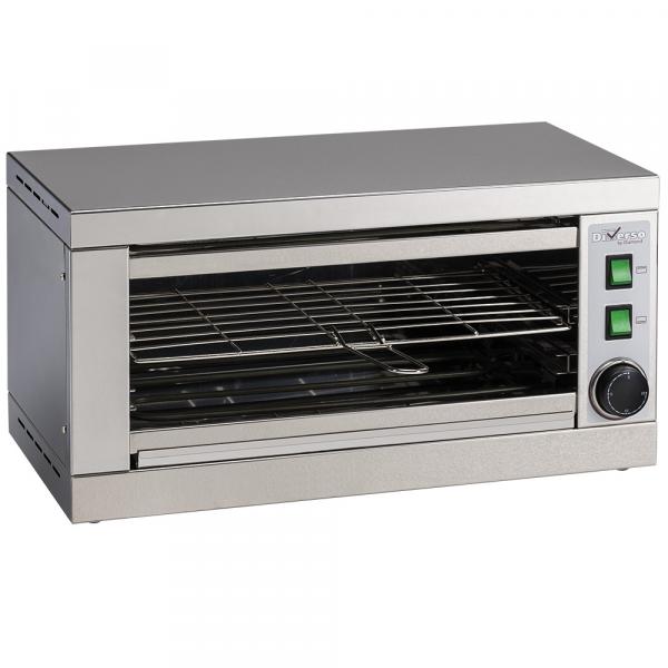 Rešetka koja se može ukloniti, sa sklopivom ručkom Unutrašnje dimenzije: 380x250h100 mm. Grejanje blindiranim otpornicima, 1 donji i 1 gornji, sa prednje strane sa zaštitom. Prednja kontrolna tabla sa izolacijom, lak pristup (bočni) za sve intervencije održavanja, električni priključni terminali u keramici. Izbor individualnih rampi za grejanje. Tajmer od 0 do 15 minuta. Uklonjivo ležište za sakupljanje. Proizvedeno od nerđajućeg čelika AISI 430. 4 gumene noge. Standardni kabl za napajanje, priključak tipa SHUKO. Uređaj izgrađen u skladu sa standardima (CE) na snazi.