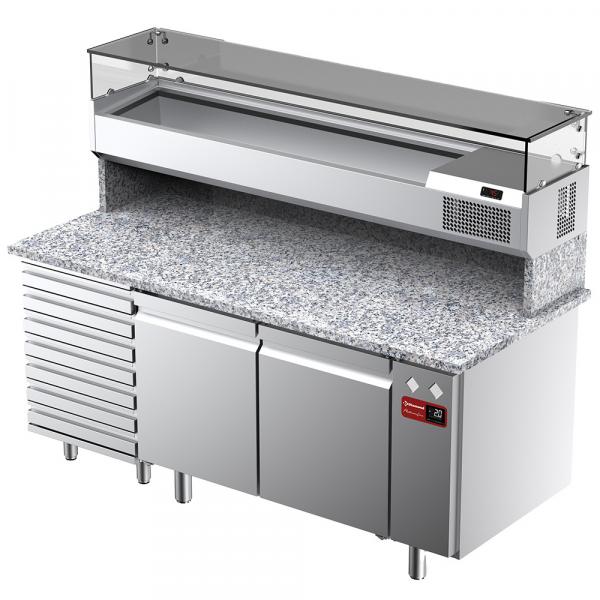 Rashladni sto za pripremu pice sa ventilacijom, sa 2 vrata i 7 fioka, rashladnom vitrinom 1800x380x410 i granitnom radnom pločom.