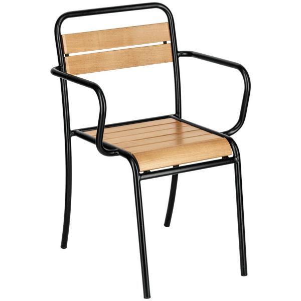 Sa Santo spoljašnjom stolicom sa naslonima za ruke, sada možete da donesete popularni industrijski stil u svoju baštu. Stolica se takođe može koristiti u zatvorenom prostoru i kombinuje različite materijale: crni čelični okvir je elektrogalvanizovan i premazan prahom, dok su sjedište i naslon za leđa napravljeni od lakiranog kestenskog drveta. Dimenzije lamela su: sjedište/zadnje rešetke širine 65 mm. Debljine 17 mm. Do 6 stolica se može složiti.