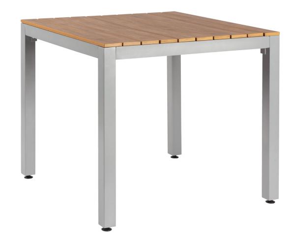 Jednostavan sto za terasu od laganog aluminijuma lakiranog prahom (Ø okvira: 5 cm, debljina materijala 1,5 cm). Ploča stola izrađena od čvrstih plastičnih letvica debljine 1,5 cm u izgledu tikovine. Sa vijcima za nivelisanje poda. Pogodno za upotrebu na otvorenom. Odgovara svim komponentama namještaja serije Resistance. Isporuka je rastavljena, montaža je jednostavna.