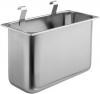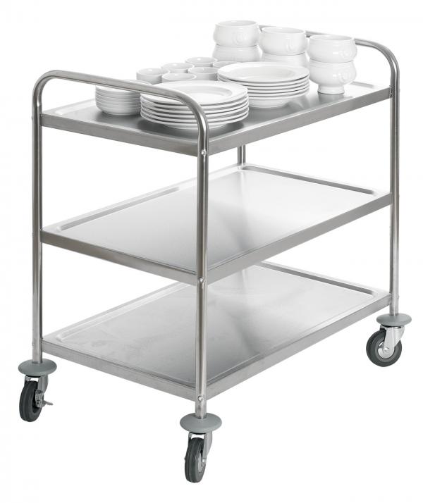 Kolica za serviranje od nerđajućeg čelika, nerđajući. Izrađena od čvrste okrugle cijevi sa duboko izvučenim dnom. Robusni dizajn za dobru stabilnost. Četiri točka otporna na koroziju sa deflektorima na zidu, od kojih se dva mogu zaključati. Jednostavna samomontaža.