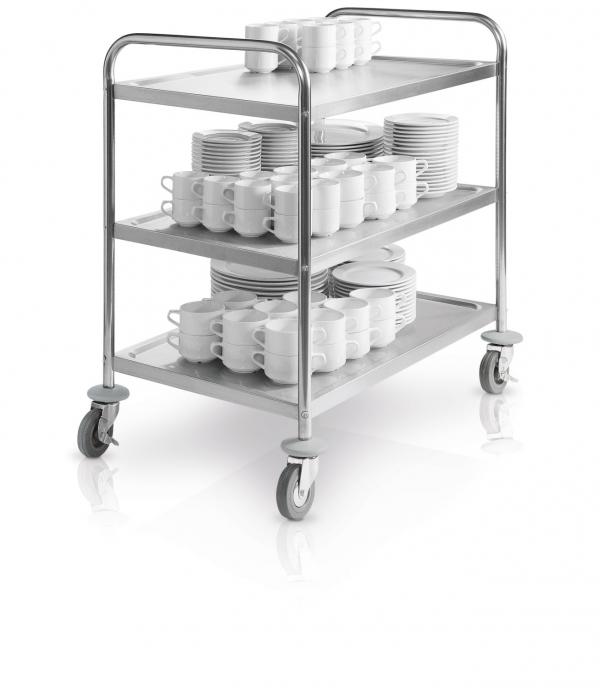 Na ovim klasično dizajniranim kolicima za serviranje možete transportovati posuđe, pribor za jelo i još mnogo toga na siguran i profesionalan način. Servisna kolica su izrađena od čvrstog hromiranog čelika i opremljena sa tri police koje pružaju dovoljno prostora za odlaganje. Nosivost po polici je 40 kg, maksimalno ukupno opterećenje je 120 kg. Kolica rade na četiri kotača, od kojih dva možete zaključati. Na taj način je osiguran siguran stalak. Na cijevnom okviru gastro kolica se lako drže i lako se kontrolišu. * Kolica za posluživanje za ugostiteljske potrebe * Klasičan, funkcionalan dizajn * Kolica na kotrljaju za siguran, lak transport posuđa, pribora za jelo i još mnogo toga * Od kromiranog inoxa 18/0 * Sa 3 police: veliki prostor za odlaganje * Veličina police: 83 x 50,5 cm * Nosivost po polici: 40 kg, maksimalno ukupno opterećenje: 120 kg * 4 kotačića, od kojih 2 sa kočnicama za sigurno postolje * Jednostavna rukovanja * Odgovarajuće posude za otpad i pribor za jelo dostupne su odvojeno * Isporuka je rastavljena, laka montaža Uz ovu porciju kolica, dobijate osnovni model koji pouzdano ispunjava svoju svrhu iz dana u dan i omogućava vam da bez napora prenosite velike terete od A do B. Kolica za gastro serviranje se isporučuju rastavljena, ali je montaža jednostavna. Odmah naručite odgovarajući pribor za jelo i otpad za vaša kuhinjska kolica!