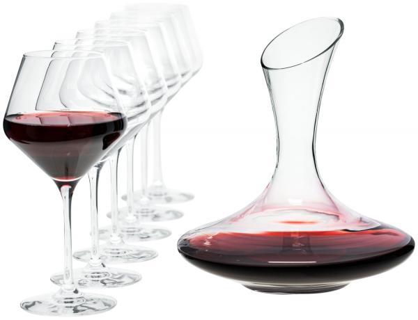 Plemeniti set kristalnog stakla koji se sastoji od jednog bokala i 6 odgovarajućih čaša za crno vino. Uz ovaj set ništa ne stoji na putu uživanju u modernom vinu.