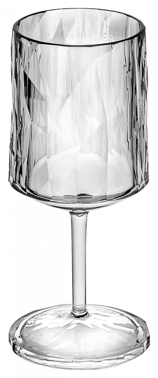 The Superglas is made of unbreakable high-tech plastic material in an attractive faceted design for red wine, spritz or cocktails. Meets the legal requirements for all areas where glass is prohibited. Insulates four times better than conventional glass. Impact-resistant, recyclable, suitable for dishwasher up to max. 70°C, rinse new glasses at over 80°C for the first time, pH-neutral cleaning agents and special rinse aid recommended for plastic glasses. Finishing from 288 pieces with your desired logo as an imprint is also possible.