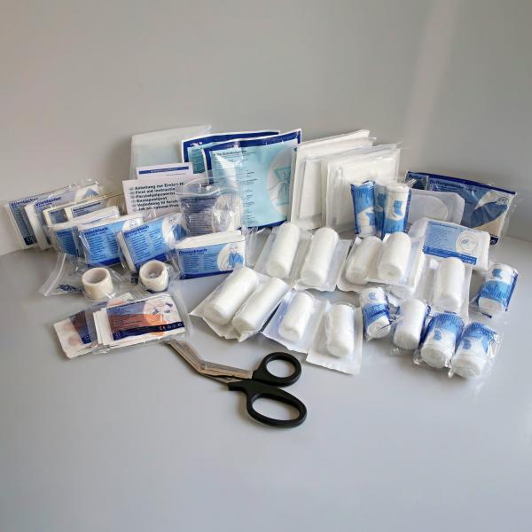 Potrošni materijal prve pomoći prema novom DIN 13169. Kao asortiman za punjenje kompleta za prvu pomoć ili za zamenu opreme za prvu pomoć. Za jednostavnu zamenu materijala za prevlačenje, komponente kompleta za punjenje su pojedinačno higijenski upakovane. Redovno proveravajte materijale za oblačenje u kompletima za prvu pomoć za potpunost i datum isteka.