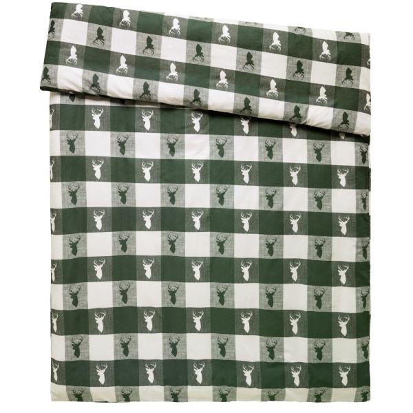 100% Pamuk. Težina pribl. 110 g/m². Provereni jorgan sa dizajnom alpskog jelena od izdržljivog pamuka. Donja strana jorgana je obična. Zatvarač za brzu promenu posteljine. Posteljina dostiže navedenu veličinu nakon tri pranja. Broj niti (TC): 144 niti po inču Tkanje: Perkal