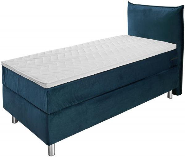 Proljetni krevet u praktičnom kompletu. Kutija sa bonnell spring core. Čvrsti drveni okvir. 7 zona džepnog proljetnog dušeka. Hladna pjena topper za udoban san. Uzglavlje sa podlogom. Srebrna čelična stopala. Visina za ulazak u krevet: 60 cm. Visina: Stopala 16 cm + kutija 22 cm + dušek 17 cm + topper 5 cm; Ukupna visina: 60 cm. Sa velurovim pokrivačem. Dostupno kao jednokrevetni ili dupli krevet. Isporučuje se sa povezanim elementima. Dostupan u tamnoplavoj i svijetloplavoj boji.