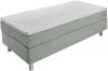 Proljetni krevet u praktičnom kompletu. Kutija sa džepnim oprugama. Čvrsti drveni okvir. 7 zona džepnog proljetnog dušeka. Gel pjena topper za udoban san. Uzglavlje sa podlogom. Srebrna čelična stopala. Visina za ulazak u krevet: 69 cm. Visina: Stopala 16 cm + kutija 27 cm + dušek 21 cm + topper 5 cm; Ukupna visina: 69 cm Sa imitacijom kožnog pokrivača. Dostupno kao jednokrevetni ili dupli krevet. Isporučuje se sa povezanim elementima. Dostupan u sivoj i krem bijeloj boji.