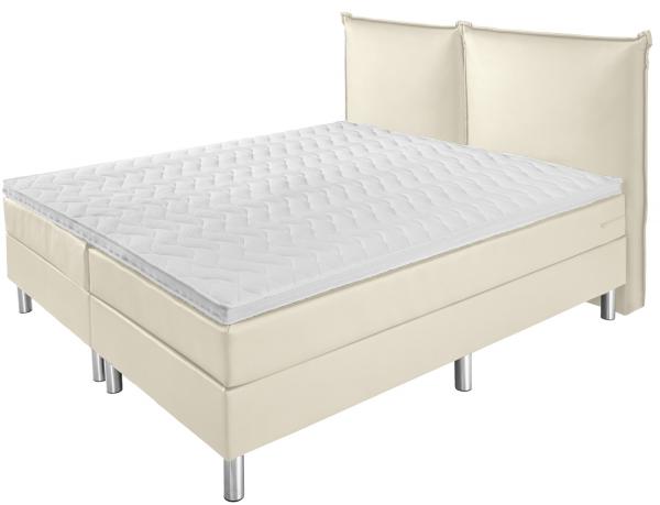 Proljetni krevet u praktičnom kompletu. Prazna kutija. Chipboard okvir. 5-zonski džepni proljetni madrac. Hladna pjena topper za udoban san. Uzglavlje sa podlogom. Srebrna čelična stopala. Visina za spavanje: 58 cm Visina: Stopala 16 cm + kutija 20 cm + dušek 17 cm + topper 5 cm; Ukupna visina: 58 cm. Sa imitacijom kožnog pokrivača. Dostupno kao jednokrevetni ili dupli krevet. Isporučuje se sa povezanim elementima. Dostupan u sivoj i krem bijeloj boji.