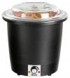 Električni lonac za supu za zagrevanje i zagrevanje supa, variva, umaka. Vanjski lonac od crno lakiranog čeličnog lima. Umetak od hrom-nikl nerđajućeg čelika 18/10, otporan na rđu. Uložak koji se može ukloniti - lako se čisti. Okretni poklopac od nehrđajućeg čelika sa šarkama sa udubljenjem za žlicu. Beskonačno podesivo, do 94 °C. Isključuje se automatski kada se postigne podešena temperatura. Incl. kontrolna lampa i magnetni držač za pričvršćivanje osam isporučenih natpisnih znakova na lonac. 2 godine garancije. Priključeno opterećenje: 0,4 kW/230 V; Sadržaj: 9 l; Težina: 4,5 kg.