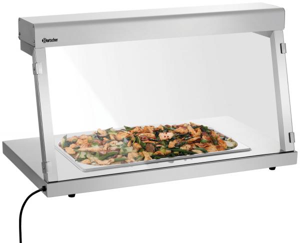Termalni most za GN kontejnere i integrisana higijenska zaštita u obliku staklenog okna. Ploča od nehrđajućeg čelika, nehrđajući čelik, aluminijumski okvir i zaštitni stakleni vrh, sa umetnutim bazenom u 1/1 GN i dubinom 40mm, infracrvena cijev za grijanje izvora toplote, snaga 0,65kW, jasna visina 34cm, uključujući On/off prekidač, dizajniran za GN -Becking sa izrezanim LxWxH 50.7 x 30 x 5cm, isporuka bez GN kontejnera, isporuka potpuno sklopljena, priključeno opterećenje 0,65kW, 230V, 50/60 Hz. 2 godine garancije