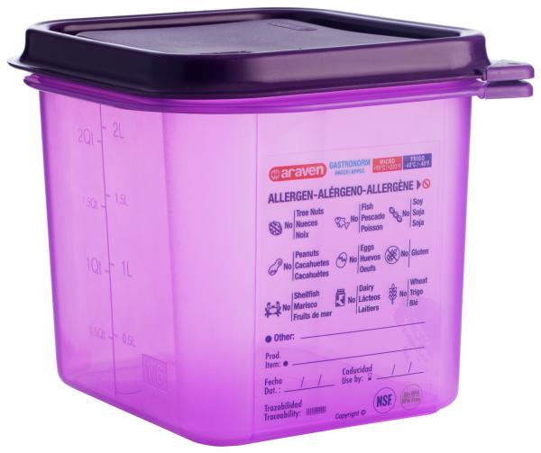 GN kontejner od polipropilena sa poklopcem. Ljubičasta boja identificira i razlikuje hranu za kupce s alergijama ili intolerancijom na hranu od ostatka kontejnera kako bi ih odvojila i zaštitila od moguće kontaminacije tvarima koje mogu izazvati alergijsku reakciju. Pravilno označavanje sprečava slučajno gutanje takve hrane od strane ove rizične grupe. Posebna trajna etiketa identifikuje alergen na hermetički zatvorenoj ambalaži, garantujući rok trajanja hrane za kupce sa alergijama ili intolerancijom na hranu.