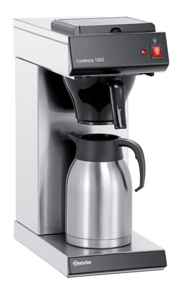 Aparat za kafu sa termos vrčem i ringlom na vrhu. Kućište od nerđajućeg čelika 18/10 hrom-nikl. Filter korpa od plastike. Dvostruko izolirani vrč, od matiranog 18/0 hromiranog nerđajućeg čelika, sa plastičnom glavom i jednom ručnom automatikom, nije pogodan za pranje u mašini za sudove. Pogodno za kontinuiranu upotrebu. Sa zasebnim prekidačem za uključivanje/isključivanje grijaće ploče, prekidačem za uključivanje/isključivanje aparata za kafu i indikatorskom lampicom za zagrijavanje. Vreme kuvanja po loncu oko 8 minuta. Minimalna količina za kuvanje je 0,5 litara. Uključujući termos bokal. Dve godine garancije. Priključeno opterećenje: 2 kW / 230 V; Kapacitet vrča: 2 litre; ØxH lonac cm: 14x25; Kapacitet po satu: cca. 16 litara; Težina: 6,8 kg.