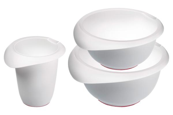 Trodelni set posude za mešanje koji se sastoji od dve posude za mešanje Krema prečnika 25 cm (2,5 l) i 28 cm (3,5 l) i umutiti lonac kremu (1 l). Pogodno za mašine za pranje sudova.