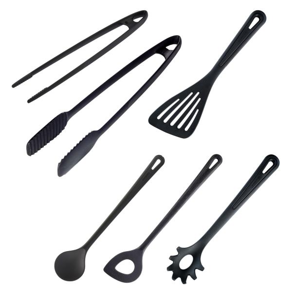Praktičan, 6-dijelni set kuhinjske pomoći napravljen od visokokvalitetnog poliamida. Sastoji se od prženja i hvataljke, lopatice, miješanja žlice, prženja i serviranja pincete, šiljate kašike za kuhanje i špageta/kašike za serviranje. Otporan na toplotu do 210°C. Pogodno za mašine za pranje sudova.