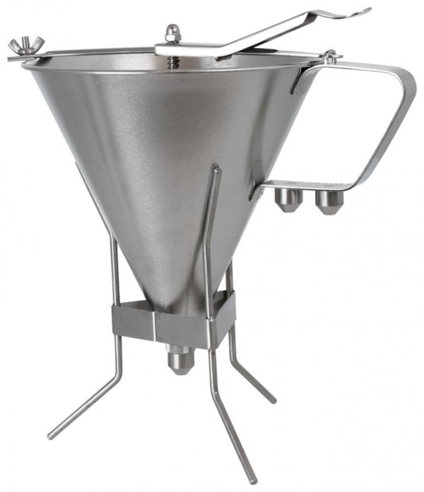 Lijevak od nerđajućeg čelika sa postoljem namijenjen za razne prelive, sirupe, soseve, fondan. Uključuje 3 mlaznice za doziranje (2, 4 i 6 mm).
