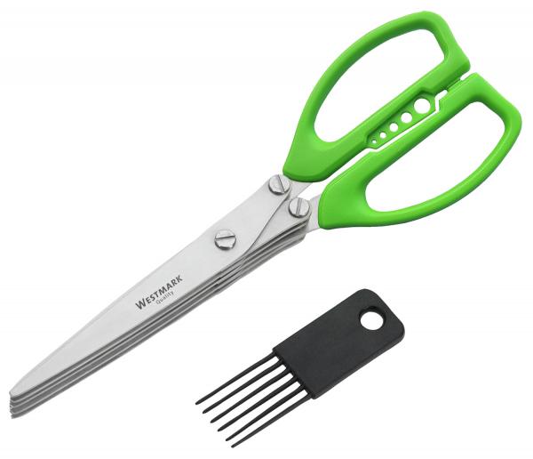 Makaze za povrće sa 5 oštrica, izrađene od poliranog nerđajućeg čelika. Reže bilje precizno i brzo. 5 rupa različitih oblika i veličina na dršci olakšavaju skidanje lišća sa peteljki. Uključuje češalj za čišćenje. Pogodno za mašine za pranje sudova.