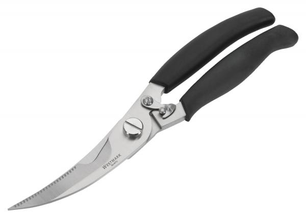 Praktične pokretne makaze od nehrđajućeg čelika, za precizno i čisto rezanje živine. Sa nazubljenom oštricom, integrisanim razbijačem kostiju, unutrašnjim oprugama i bravom. Rukovanje bez klizanja zahvaljujući plastičnim drškama. Oštrice treba očistiti ručno.