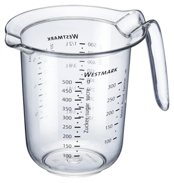 Izrađen od visokokvalitetne SAN plastike. Skala mjerenja na njemačkom, engleskom, francuskom. Mjerne jedinice: g brašno, g šećer, ml litara, fl.oz, pinte. Slaganje, pogodno za mašine za pranje sudova.