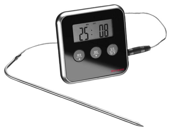 Digitalni termometar za kontinuirano praćenje temperature. Za stajanje ili vješanje sa magnetom. Temperaturna sonda napravljena od nehrđajućeg čelika. Sa funkcijom upozorenja. Nije pogodno za mašine za pranje sudova. Temperaturni opseg: 0°C do 250°C. Isporuka uključujući bateriju (AAA, 1.5V).