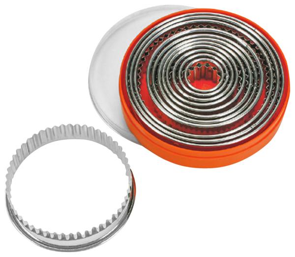 9-dijelni set za rezanje kolačića izrađen od nehrđajućeg čelika 18/10, otporan na hrđu. Debljina materijala 0,4-0,5 mm. Visina 30 mm. Set od 9 okruglih nazubljenih oblika prečnika 30, 40, 50, 60, 70, 80, 90, 100 i 110 mm. Mašina za pranje sudova je bezbedna. Skladište: Plastični kontejner