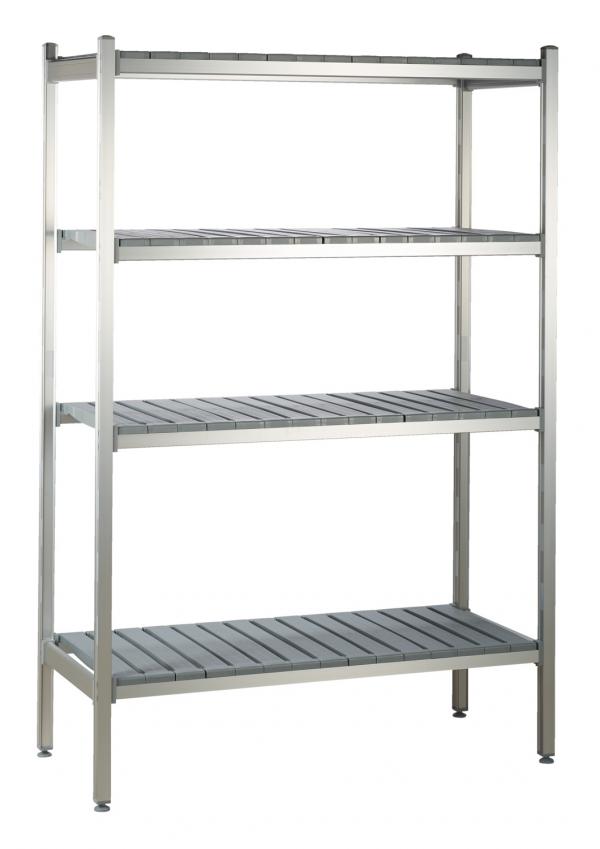 2 bočni okviri u aluminijumu i 4 police sa aluminijumskim okvirima i oštricama u polietilenu, stopala u aluminijumu. Kapacitet opterećenja do 250 kg po polici, sa ravnomjernom distribucijom na svim policama do 1000 kg ukupno, otporan na mraz na -38°, otporan na toplotu na +90°C, siguran za pranje posuđa. Polica i rešetke se mogu umetnuti i ukloniti bez potrebe za demontiranjem osnovne police. Uključujući 24 nosača za montažu i gumenog malleta.