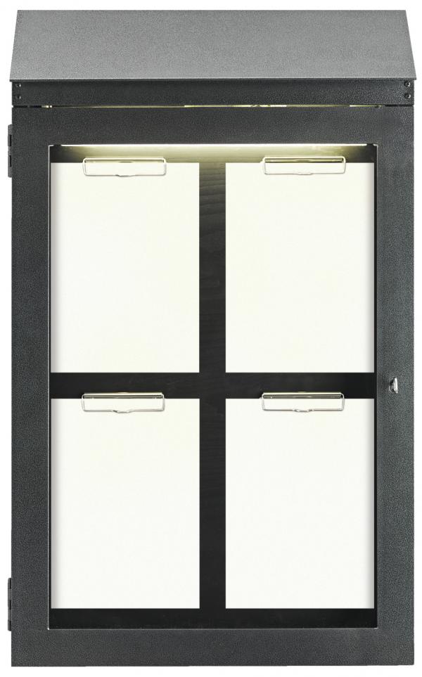 Zidni meni Klimt sa ravnim krovom sa stilom dočekuje vaše goste već ispred vrata. Zadnji i bočni zidovi čvrste vitrine su napravljeni od farbanog drveta otpornog na vremenske uslove, okvir je od čvrstog kovanog gvožđa. Kutija menija je dostupna u različitim veličinama, opremljena vratima koja se zaključavaju i zaštićena ravnim krovom. Kartice menija imaju prostor unutar vitrine i optimalno su osvetljene isporučenim svetlom.