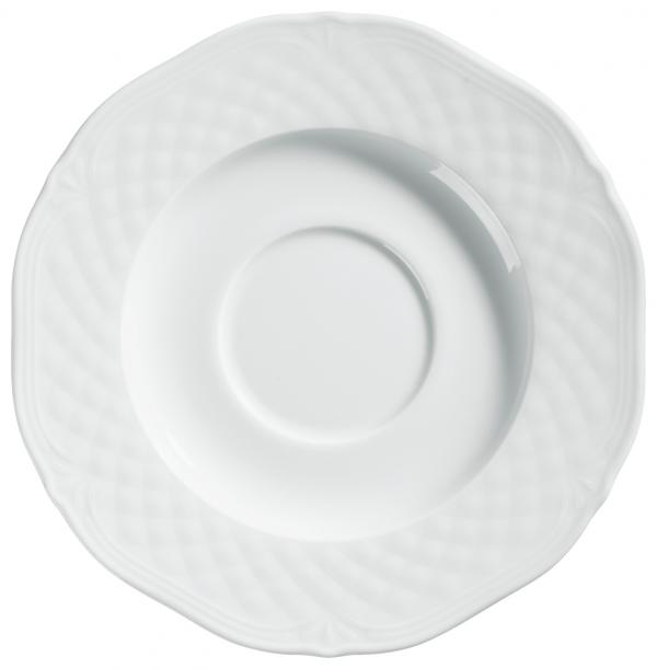 Bijeli porculanski tanjir za espresso. Sa klasičnim elegantnim reljefom. Može se prati u mašini za suđe i može se koristiti u mikrotalasnoj pećnici.