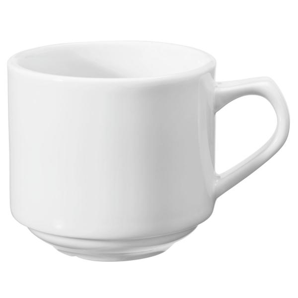Bijela porcelanska šolja za espreso. Može se prati u mašini za suđe i može se koristiti u mikrotalasnoj pećnici.