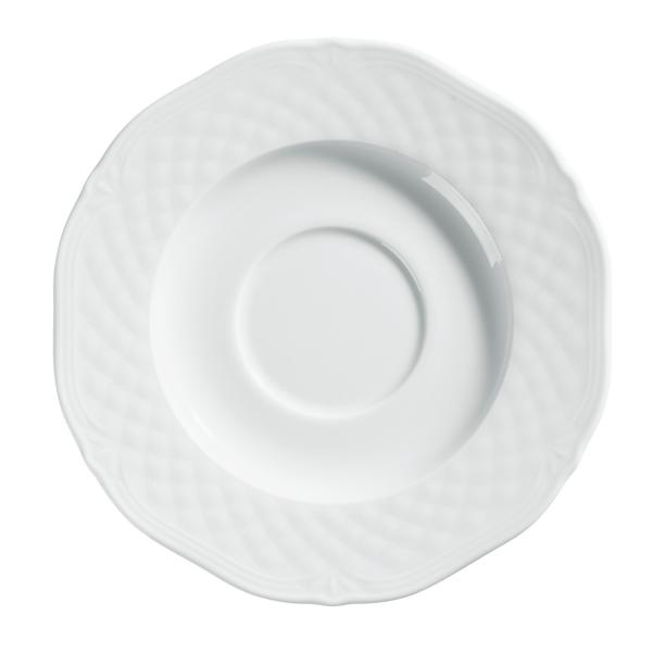 Bijeli porculanski tanjirić za kafu. Sa klasičnim elegantnim reljefom. Može se prati u mašini za suđe i može se koristiti u mikrotalasnoj pećnici.