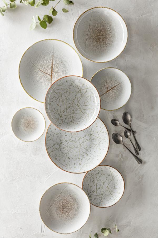 Colored porcelain plates with digital print featuring a fine leaf pattern. Can be used and combined in a variety of ways. Without flag. Dishwasher safe and microwaveable.
