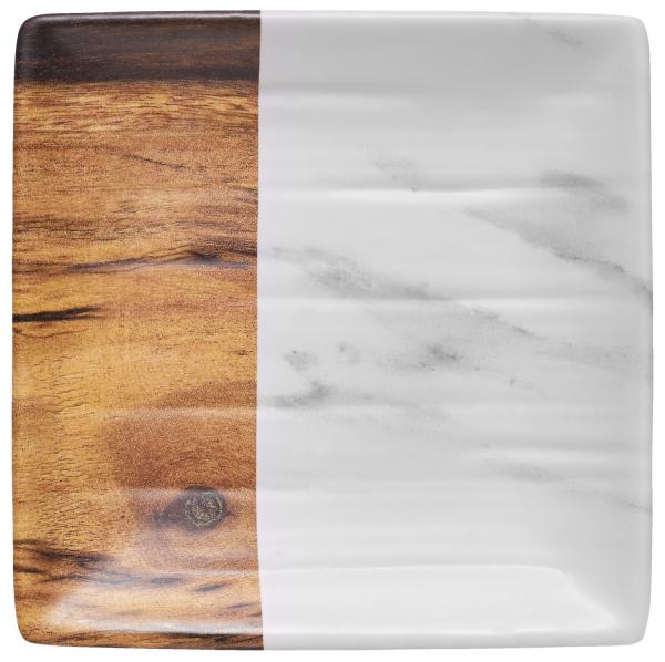 Kvadratni tanjir od melamina u mermernom/drvetnom izgledu. Izdržljiv zbog otpornosti na udarce i lomljenje. Opseg primene između -30 °C i +70 °C.