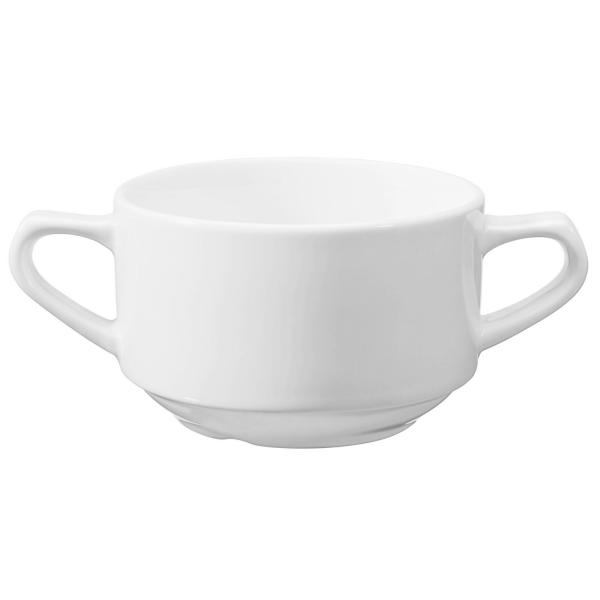 Bijela porcelanska šolja za supu. Jednostavan, bezvremenski oblik. Može se prati u mašini za suđe i može se koristiti u mikrotalasnoj pećnici.